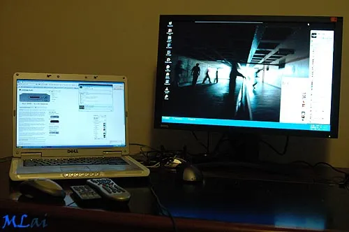 Not a real flattering picture, but you have to see it in real life. Its big, stand is very sturdy, kind of neat and has all the inputs you could ever want… So there is DVI-D, D-SUB, HDMI, Component, S-Video, and Composite. There is also 3 USB ports, 2 on the side and one on the top. Resolution runs at 1920 * 1200 and handles 1080P. So to show you the size… here is my 15.4 inch Dell Inspiron 6000 next to the 24 inch. When i first saw this photo, i thought my laptop looked like a 12 inch next to a 19 inch: