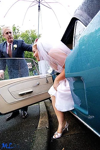 Bride getting out of the car - as you can see, very wet.