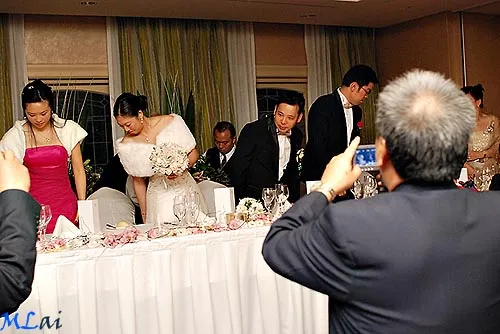 So, yesterdays wedding was a lot longer than I anticipated. This was due to three stooges that endevoured to ruin my day as well as ruin my shots. I guess the only positive thing coming out of it was how candid my shots really were. I mean I saw what everyone else saw, three guys running in front of everyone to get their shots, not caring for me and vince and especially the guests. One was armed with a D70, another with a panasonic camcorder, and the last with a video light. So started with the tea cereomy at the brides place, which was fantastic. The stooges took charge over the whole running of show. Moved onto a tea ceremony at the grooms, which lead to my most demoralising experience, having the video stooge, grab the top of my head to move it aside for his shot. This was followed by him literally talking behind my back, straight into the video camera mind you, about where I was and how i was getting into his shot. This was followed by him exclaiming to Vince how he can move all around the place and how versatile he is at being a video man, and I started thinking to myself, “if you are so versatile, I should never be in your way”. Luckily enough they didn’t come along to the formals. I was having a rough time dealing with it. Then came the ceremony at the Mariott Hotel as well as reception. This time, the photographer stooge, managed to walk infront of my lens, as they were exchanging rings. I managed to get one shot out of it. Then came the signing of the certificate which again, as the witnesses were signing, he again managed to stand right in front of my lens. Not just in front of my lens, but in front of everyone, so there was no where I could’ve moved to even get a shot. Then came photos with the bride and groom where he continually stuck his lens next to Vince’s to get a shot. This just lead to many of the guests staring at his lens instead. It didn’t register to the guests that they should’ve been looking at Vince. Then came reception - cutting the cake. So the MC announces “could the official photographer please come up first”, and guess who runs up there, the three stooges. They arrive there before me and Vince. Also standing in front of everyone again, the videolight stooge was shining it on them, in a way, it was good, but from a guests point of view, it looked disgusting. Then came the speeches where they stood a table away from the mic, and proceeded in shining this horrible light at them, and again, in front of everyone. Finally, end of the night, bride had changed into another gown (3 in total), and as the video stooge was recording, out in the open foyer area, STILL managed to push me out of the way to get his shot, even though, there was no one around me in a radius of 2 metres!